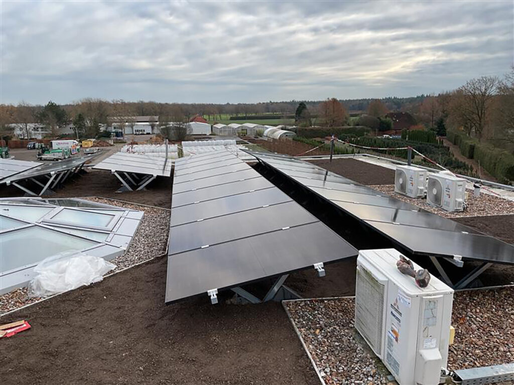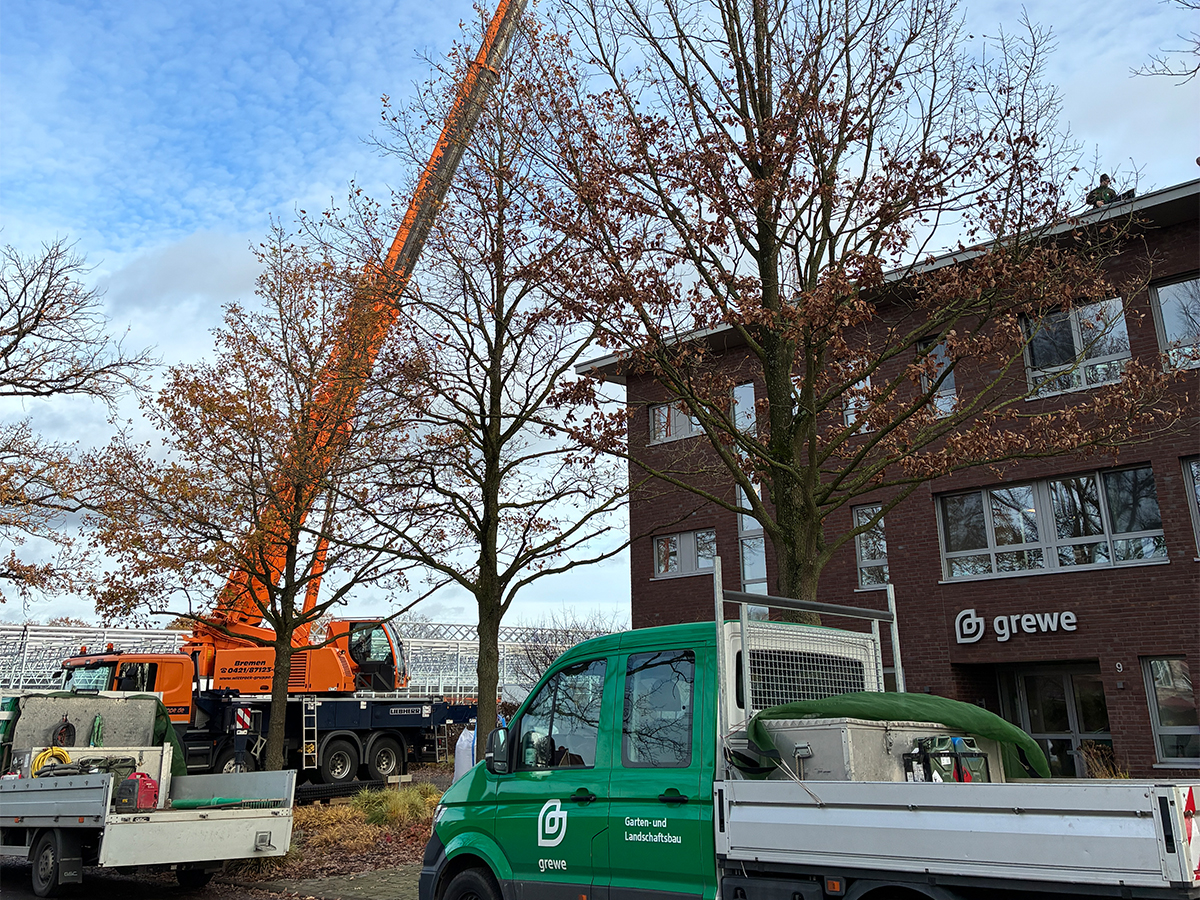 Eine besondere Herausforderung ist bei Dacharbeiten immer die Logistik. Dafür hat das Team um Fred Hand in Hand mit der Solaranlagen-Firma gearbeitet. Drei Kraneinsätze waren nötig, um das gesamte Material aufs Dach zu bringen und zu verarbeiten. Unsere neue PV-Anlage auf dem Holdinggebäude hat circa 27 kWp-Peak. Mehr geht aufgrund der Dachflächengröße und Verschattung durch die großen Eichen leider nicht. In Summe wird die Anlage laut Berechnung in etwa 27.000 bis 28.000 kWh Strom pro Jahr erzeugen. Dieser wird für die Elektro-Ladesäulen zur Verfügung stehen sowie für den Verbrauch im Holdinggebäude selbst.