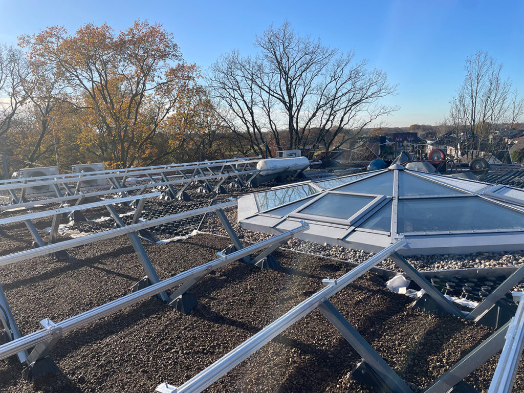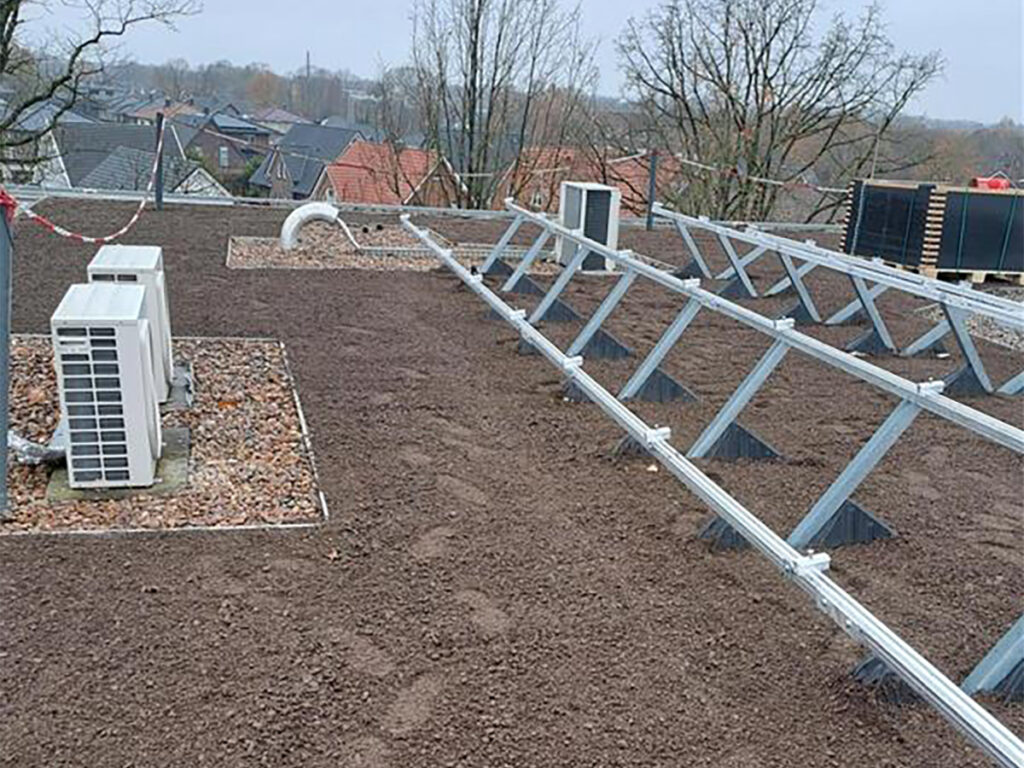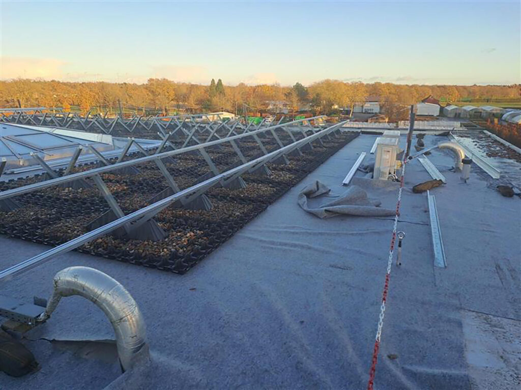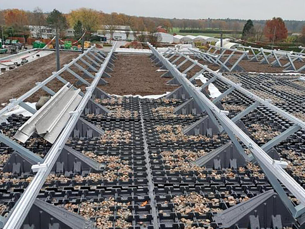 Ende November, Anfang Dezember war es soweit: Unser Holdinggebäude hat eine Dachbegrünung sowie eine PV-Anlage erhalten. Ein Team von Grewe Rotenburg bzw. Harsefeld hat unter der Bauleitung von Fred Brunk (Grewe Harsefeld) auf der 400 Quadratmeter Dachfläche die Begrünung angelegt. Sie haben rund 28 Kubikmeter Substrat verbaut. Dazu kamen noch 14 Tonnen Kies (16/32), zur Beschwerung der Unterkonstruktion für die Solarmodule, sowie als Kiestreifen an aufsteigenden Bauteilen. Die Sedumsprossen, die das Dach dann begrünen, werden erst im Frühjahr aufgebracht, da aktuell nicht verfügbar. Im Sommer sorgt die Begrünung auf dem Dach dann für Verdunstungskälte und dadurch für eine bessere Effizienz der Solarmodule.