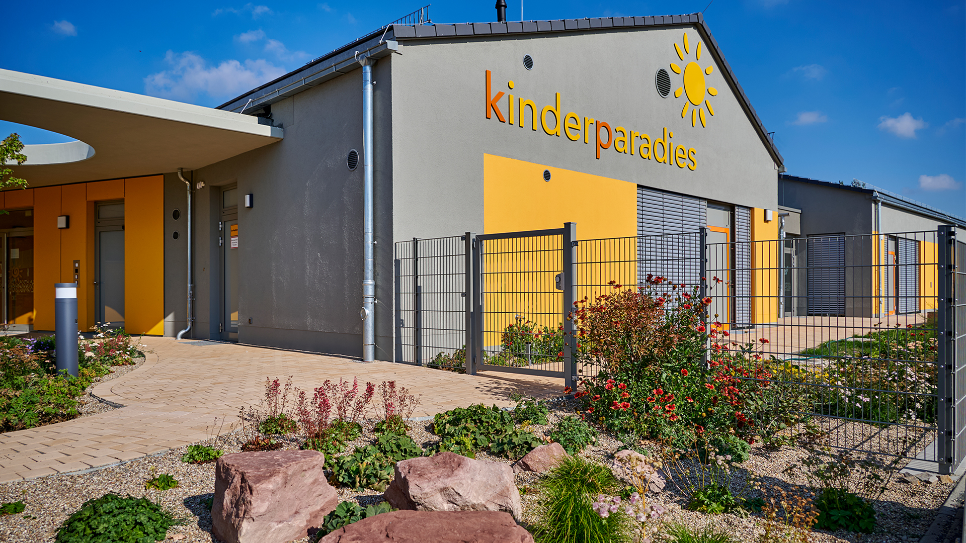 Im Rahmen des Neubaus einer Kindertagesstätte wurde Grewe Magdeburg mit dem Bau der Außenanlagen beauftragt. Es entstand eine abwechslungsreiche Spielfläche mit Sand und Rasen, Rutsche und Klettergerüst sowie ansprechenden Staudenbeeten und Sitzgelegenheiten.