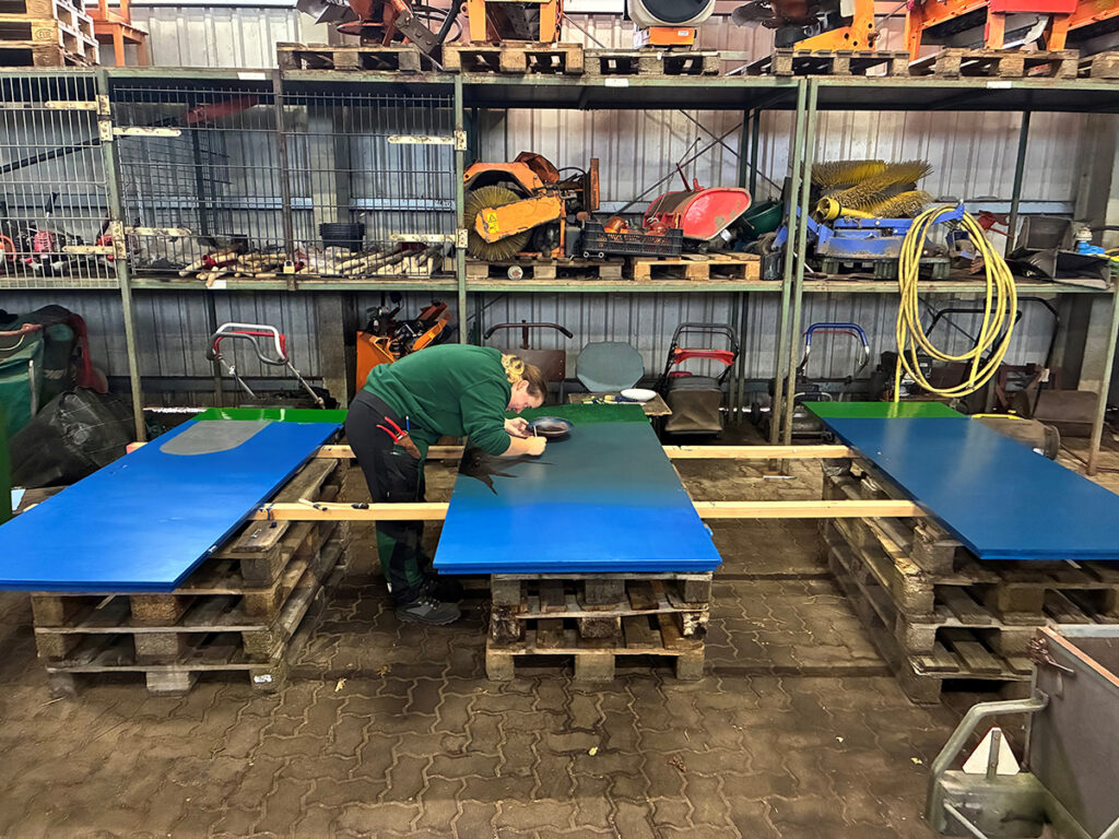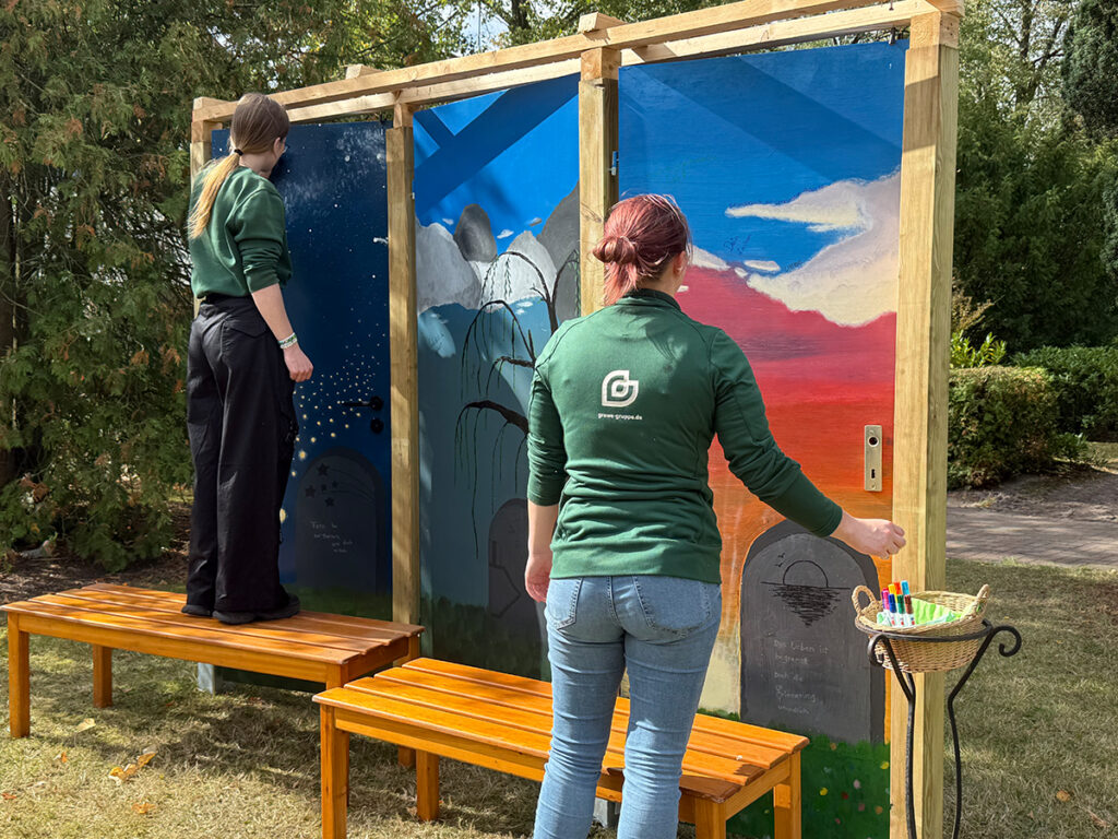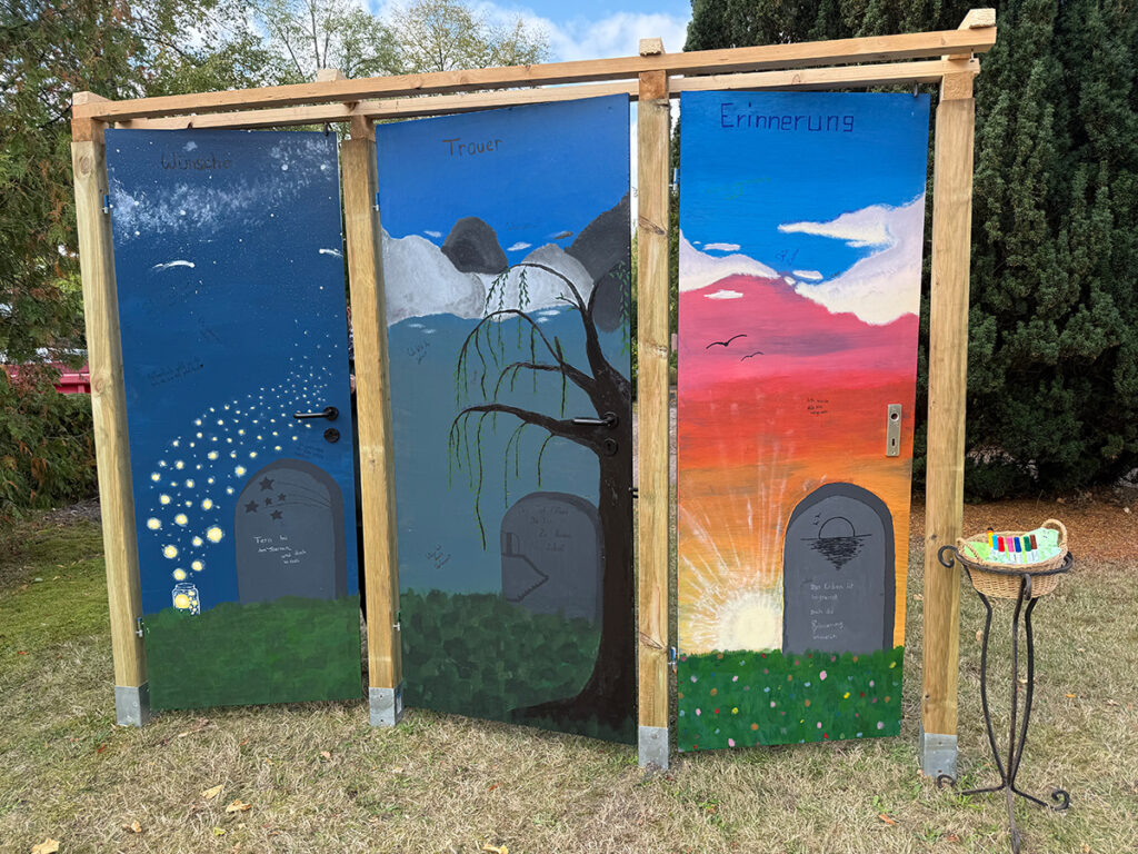 Wie kreativ Friedhofsgärtner:innen sind, haben drei unserer Kolleginnen gezeigt: Cora, Stella und Lisa haben ein ihnen vorgegebenes Thema nach ihren Vorstellungen umgesetzt. Entstanden ist ein Triptychon aus Türen, die die drei Themen Wünsche, Tod und Trauer sowie Erinnerungen aufgreifen. Die selbstgestalteten Türen sind für ein dauerhaftes Aufstellen konzipiert. Die Besucher dürfen auf die Türen schreiben, was sie mit dem jeweiligen Oberthema assoziieren. Dafür stand eine Box mit Stiften parat, auf die jeder zugreifen konnte. Eine schöne Idee, um das Thema Tod mit seinen Facetten den Menschen näher zu bringen.