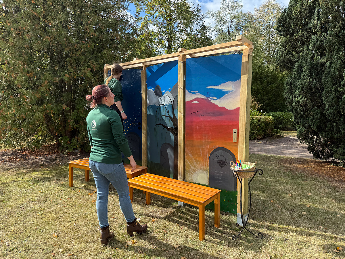Wie kreativ Friedhofsgärtner:innen sind, haben drei unserer Kolleginnen gezeigt: Cora, Stella und Lisa haben ein ihnen vorgegebenes Thema nach ihren Vorstellungen umgesetzt. Entstanden ist ein Triptychon aus Türen, die die drei Themen Wünsche, Tod und Trauer sowie Erinnerungen aufgreifen. Die selbstgestalteten Türen sind für ein dauerhaftes Aufstellen konzipiert. Die Besucher dürfen auf die Türen schreiben, was sie mit dem jeweiligen Oberthema assoziieren. Dafür stand eine Box mit Stiften parat, auf die jeder zugreifen konnte. Eine schöne Idee, um das Thema Tod mit seinen Facetten den Menschen näher zu bringen.